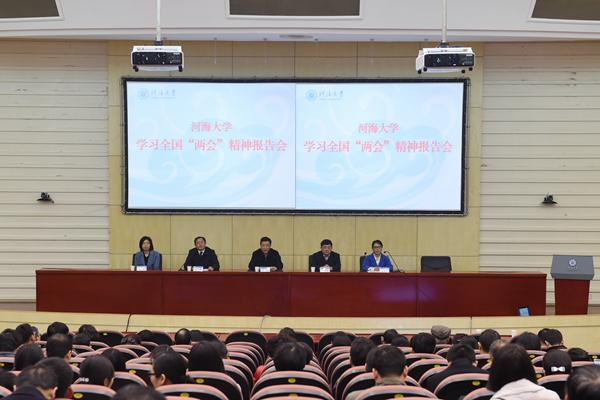 校领导,校党委中心组成员,二级单位党委中心组成员,科级及以上干部,师生代表参加了报告会。常州校区通过远程视频系统参加了会议。(文/李婉婷 图/朱昊)