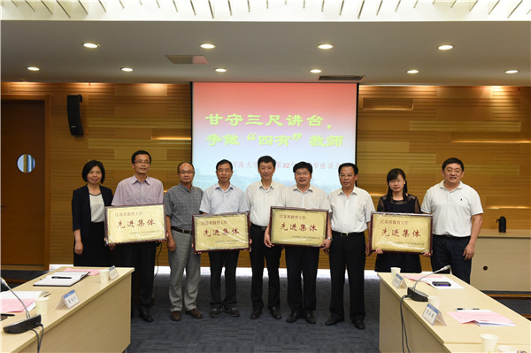 会上还向获得江苏省教育工作先进集体的单位和获得江苏省教学名师、江苏省优秀教育工作者的同志颁发了荣誉证书和奖牌。(文/徐荟华 图/朱昊)
