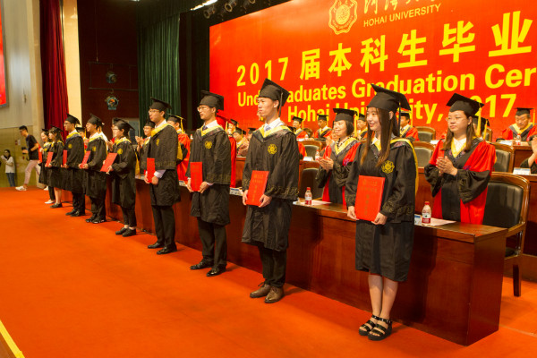 毕业生代表大禹学院工程力学徐芝纶班李泓辰表达了对母校的依依惜别之情和对老师的感激之情。毕业生代表企业管理学院工商管理专业周璟维、在校生代表物联网工程学院2014级通信工程专业胡金鹏献词,共同发出青春誓言,将带着河海赋予的精神,扬帆远航,在更加广阔的人生舞台上舞出自己的风采,为祖国添彩,为母校争辉。