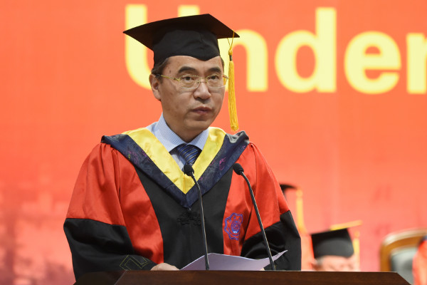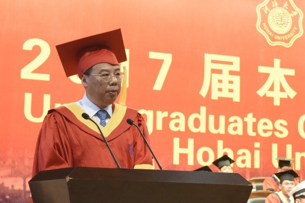 毕业典礼上,徐辉校长发表了题为《同心奋进 自我超越》的演讲,向奋力拼搏、学有所成的各位同学表示最热烈的祝贺!向悉心培育毕业生成长成才的各位老师和家长致以崇高的敬意和诚挚的问候!徐校长说,四年的时光转瞬即逝,同学们以梦为马,不负韶华,劈波斩浪,坚定前行。他以“进取心”为主题和同学们分享了所思所得,他指出,百年河海从开启中国水利高等教育之先河到20万河海人桃李芬芳遍天下,代代河海人始终以不辜负国家和社会期许为己任,志坚前行,躬身实践,在国家建设最需要的地方留下了最难忘的铿锵足迹。新时代的河海人,理应在祖国的四面八方、在国民经济的各个领域,同心奋进,自我超越,为中华民族的伟大复兴发挥更加重要的作用,让生命在不断进取中发热和闪光。徐辉校长强调,进取的路上要找准人生方向,青年人要树立起坚定正确的理想信念和目标,激发起旺盛的求知欲、强烈的好奇心和努力上进的精神动力;进取的路上要明确行动路线,从时代主题出发,同心同向谋划事业和工作;进取的路上要做到全力以赴,学会用“追求卓越”这块磨石砥砺自我;进取的路上要不断超越自我,始终保持创造性张力,以一种积极的态度对待生活,自动自发地争取最大的进步。在百年河海全面推进“双一流”建设的征程中,河海学子们也正翻开人生的崭新篇章,徐辉校长勉励毕业生们同心奋进,实现新跨越,共创新辉煌!