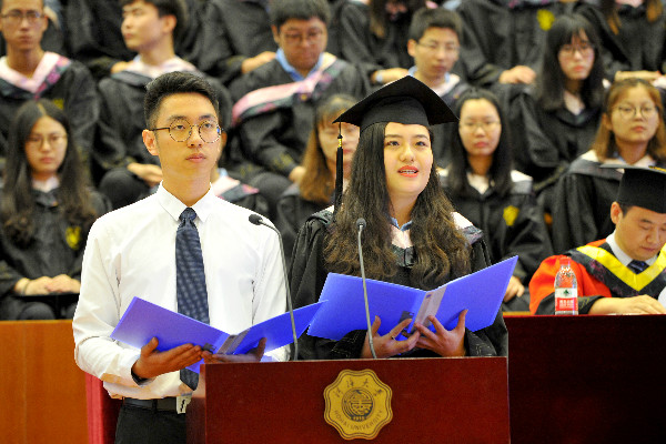 毕业生代表企业管理学院工商管理专业周璟维、在校生代表物联网工程学院2014级通信工程专业胡金鹏献词