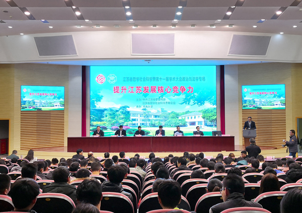 大会聚焦“法治社会建设”和“社会治理创新”,设法学、政治学两个分会场进行了研讨。南京大学法学院副院长宋晓教授就《完善涉外争议解决机制对于提升江苏发展核心竞争力的意义》问题,南京师范大学法学院院长蔡道通教授就《法学研究如何贡献思想与对策支持江苏发展核心竞争力的提升》问题,东南大学法学院龚向和教授就《新时代的社会权与经济发展》问题,中共江苏省委党校政法部副主任梁三利教授就《让法治成为江苏发展核心竞争力的重要标志》问题,开云电竞网公共管理学院政治学研究所所长许佳君教授就《工程移民政治学》问题,作了学术交流发言。