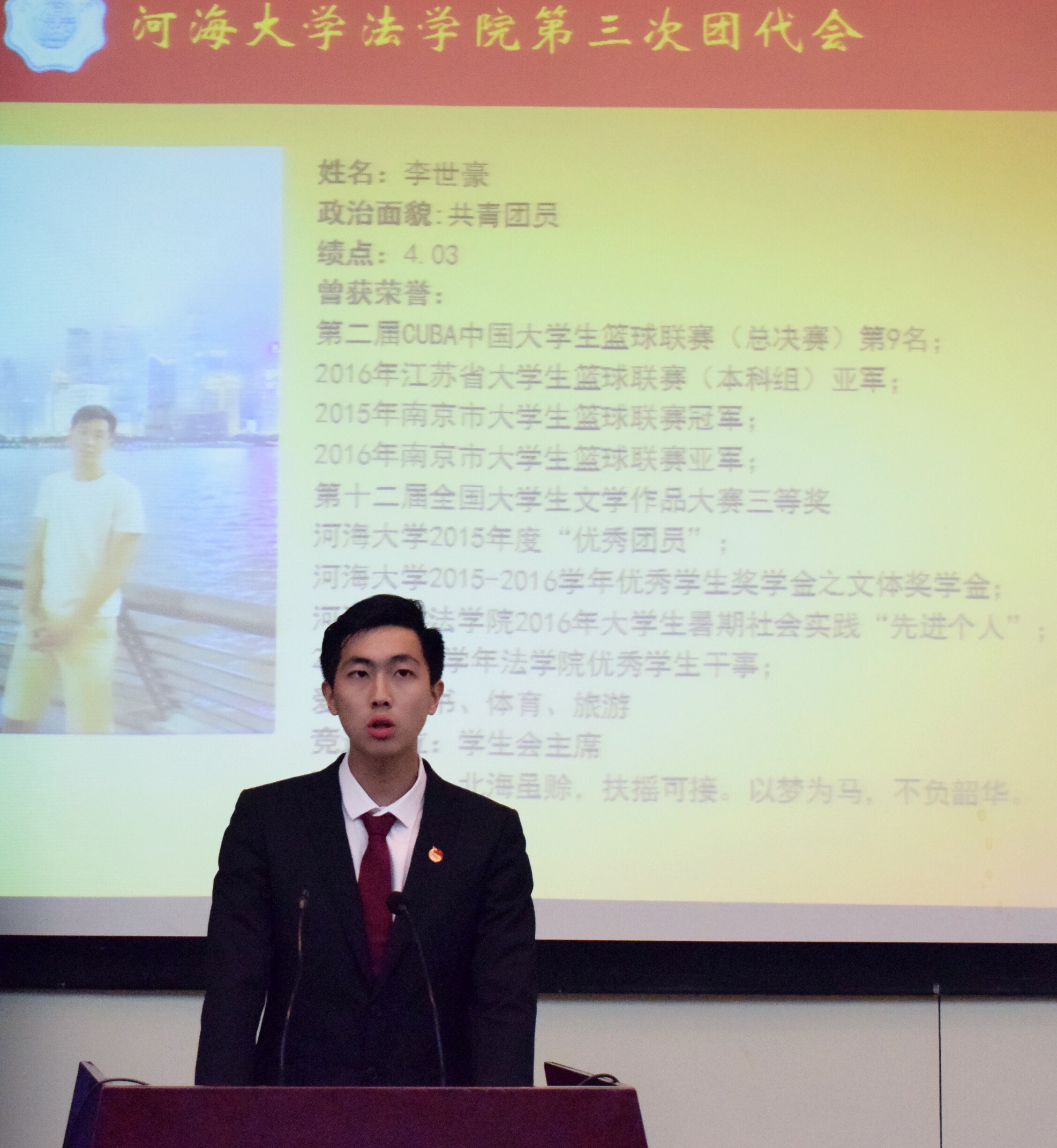 李世豪,男,汉族,中国共产党预备党员,法学院法学专业2015级学生。曾获开云电竞网文体奖学金、精神文明奖学金、社会工作奖学金,第二届CUBA中国大学生篮球联赛(总决赛)第9名、第十二届全国大学生文学作品大赛三等奖、第十九届江苏省运动会高校部男子篮球第1名、2016年江苏省大学生篮球联赛(本科组)第2名、2017年南京市大学生篮球联赛冠军。曾获得江苏省运动会“体育道德风尚”运动员、开云电竞网优秀学生干部、开云电竞网优秀共青团员等多项荣誉称号。