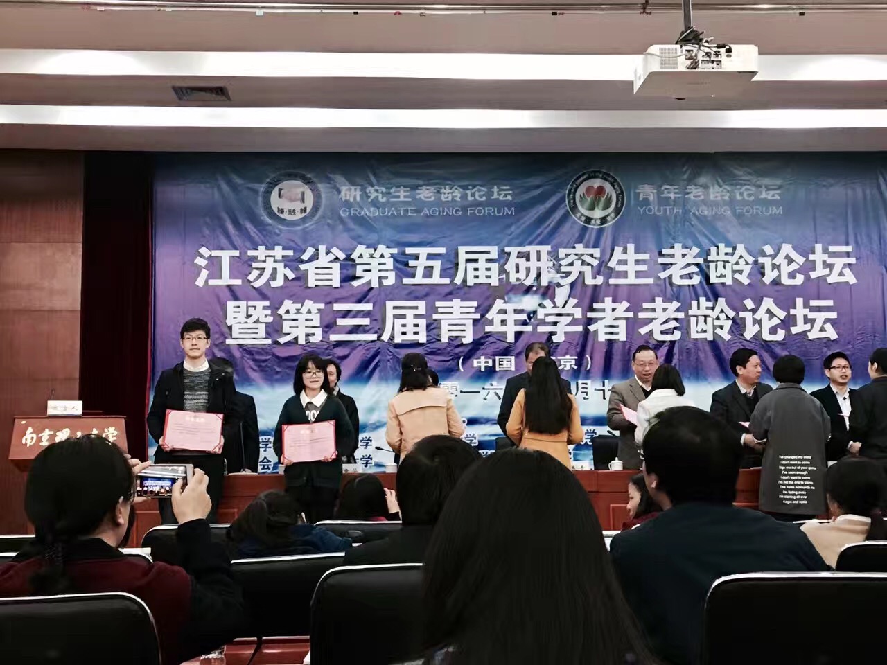 王中汉的学术热情不止于课堂知识的学习,他还积极的参与各类社会调查并主动开始了科研论文的写作。在大二下学期时他完成了一篇论文初稿,抱着试试看的心态,参加了江苏省老龄科学研究生论坛,意想不到的是,他竟然打败了大部分参加的硕士和博士生,成为了“江苏省第五届研究生老龄论坛”论文一等奖获奖者,这让他深受鼓励。