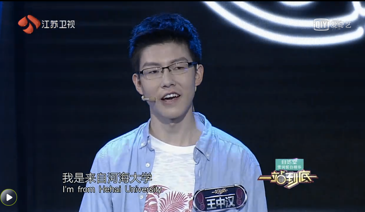 初入河海,王中汉还是一个懵懂的大学新鲜人。在大一下学期的机会他得到了一个机会去江苏卫视知识问答节目《一站到底》现场录制当观众,“我记得当时坐在片场的一个小角落,那是镜头扫都不扫一下的地方”,看完整场节目之后,他觉得“题目一点都不难,我也想去试一下”,但是报名的热情却被周围的朋友冷嘲热讽,因为一直以来《一站到底》舞台都是清北牛剑等知名高校硕博士的天下,从来没有河海人登上过这个舞台。王中汉决定尝试一下,在后来的测试题目时,他用正确率87%的绝对优势进入了录制环节,并在不被看好的情况下打遍全场,击败了当时连任两期,本科毕业于北京大学,硕士毕业于清华大学的人气擂主张泽,那一期的收视率也登上了全时段第一的宝座。