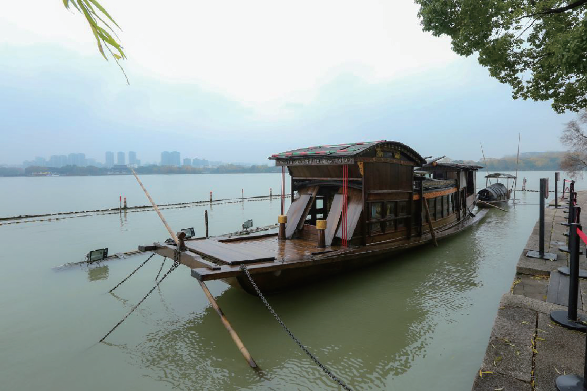 如今停泊在烟雨楼前水面上的游船,是1959年仿制的。这年夏天,根据中共浙江省委、嘉兴地委指示,嘉兴县委决定筹建南湖革命纪念馆并仿制“中共一大南湖会议纪念船”,争取在国庆十周年时对外展出。为了实施这一决定,嘉兴成立了以县委副书记沈如淙任主任、县委宣传部副部长郭竹林任副主任兼筹建办公室主任、宣传部干事董熙楷任工作人员的南湖革命纪念馆筹建委员会。根据中央有关部门“南湖建馆的中心是船的问题”的指示,筹建委员会成员经过大量的走访、调查,赶制了一只双夹弄丝网船模型。郭竹林和董熙楷带着这只模型去了北京,准备将它呈交给毛主席和董必武审定,可惜当时毛主席到西南视察去了,董必武也去了西北,要见毛主席、董必武必须等到几天以后。于是,中共中央办公厅的同志介绍郭竹林、董熙楷两人先到中共一大保卫人员、亲自租船的王会悟处访问。王会悟对船模进行仔细观察后,回忆说:“这只船的模型,同当时一大代表开会的那艘船的样子倒是很像的。但就是太大了点,实际上还要小点。”据王会悟回忆,当时一大开会租用的应该是单夹弄丝网船。因为筹建纪念馆的工作多、任务重、时间紧,郭竹林、董熙楷在北京不能久留,于是在中共中央办公厅留下了一份给党中央、毛主席的报告后,随即动身返回嘉兴。返嘉后,又立即做了一只单夹弄丝网船模型寄往北京,直接呈送党中央、毛主席审定。出乎大家意料,郭竹林、董熙楷在北京所写的报告竟被直接送到了毛主席的手里,毛主席还作了批示,大意是“我南征北战,记忆不清了,请董老过问此事、好好看看”。董必武看了嘉兴寄呈的单夹弄丝网船模型后作了答复:“船就是这样,但大船后面还有一只小船,是保卫人员坐的,万一发生情况,也可以用于撤退。”之后,嘉兴方面又询问了王会悟,她也说确有一只小船。这样,又增做了一只小拖梢船模型。历经几个月的艰苦奋战,南湖红船终于仿制完成,并在国庆十周年那天下水,停泊在嘉兴南湖湖心岛烟雨楼前东南方向的水面上。南湖红船真实地还原了中共一大南湖会议召开时的历史场景。