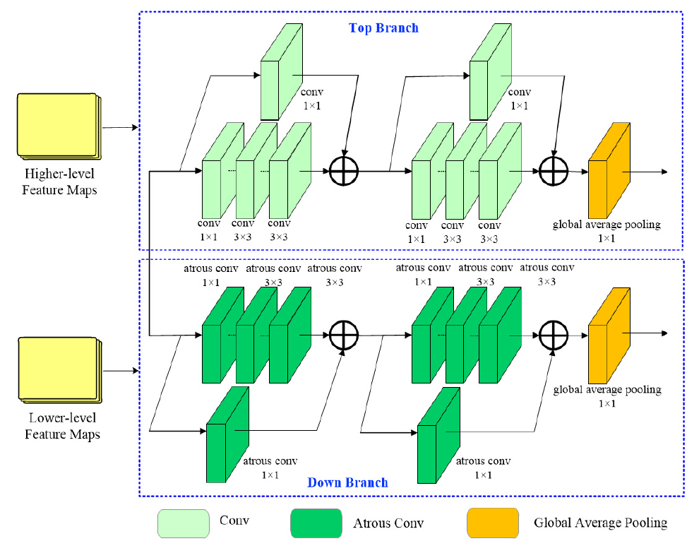 该方法的主要工作在于包括,通过增强特征金字塔模块对深层特征图丰富的语义信息进行传播,以弥补浅层特征图该信息的缺失;通过跨尺度信息融合模块保持不同特征图共性的同时也利用各自优势特征以增强特征;通过双支路深层特征融合模块的不同感受野提取多尺度上下文信息,引导网络兼顾全局特征和局部特征。结果证明,所提出的算法在多个大规模公开数据集上的分类表现均远好于基准方法,与业内前沿方法相比具有明显优势。