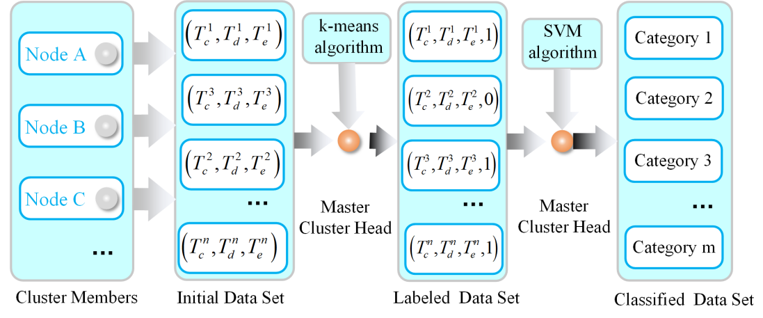 针对簇型水声传感网中的信任安全问题,韩光洁团队提出一种基于机器学习的协同信任模型,该模型通过分析不同攻击方式对网络功能的影响,总结出通信信任、数据信任和能量信任这三类信任证据,建立基于滑动时间窗的证据生成与信任更新方法,利用k均值和支持向量机算法对生成的信任证据进行分类,进而利用分类结果筛选出网络中的恶意节点。