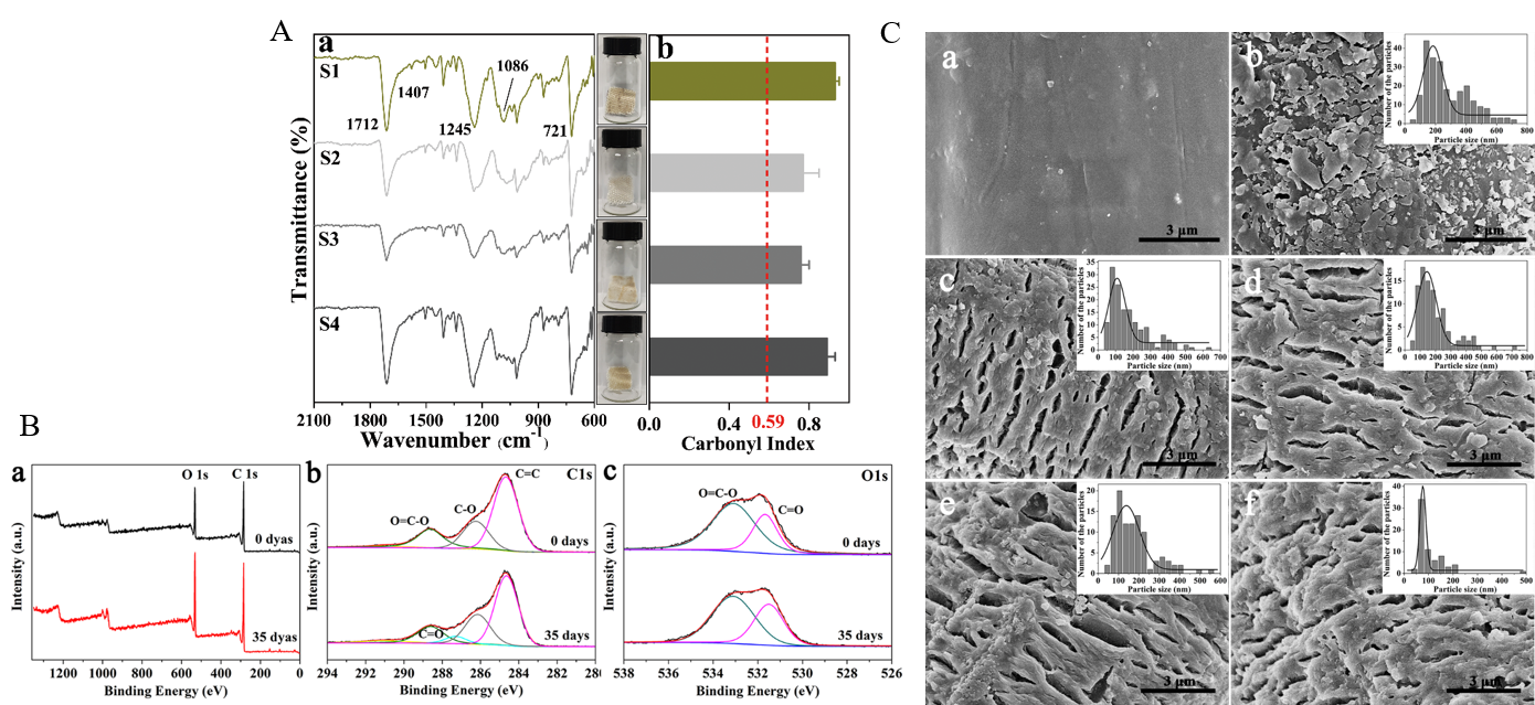 图2 PET土工布光老化机制图(A 野外围垦区PET土工布样品的化学性质表征;B 光老化模拟实验PET土工布的XPS谱图;C 光老化模拟实验PET土工布风化表面的SEM图及等效粒径分布图)
