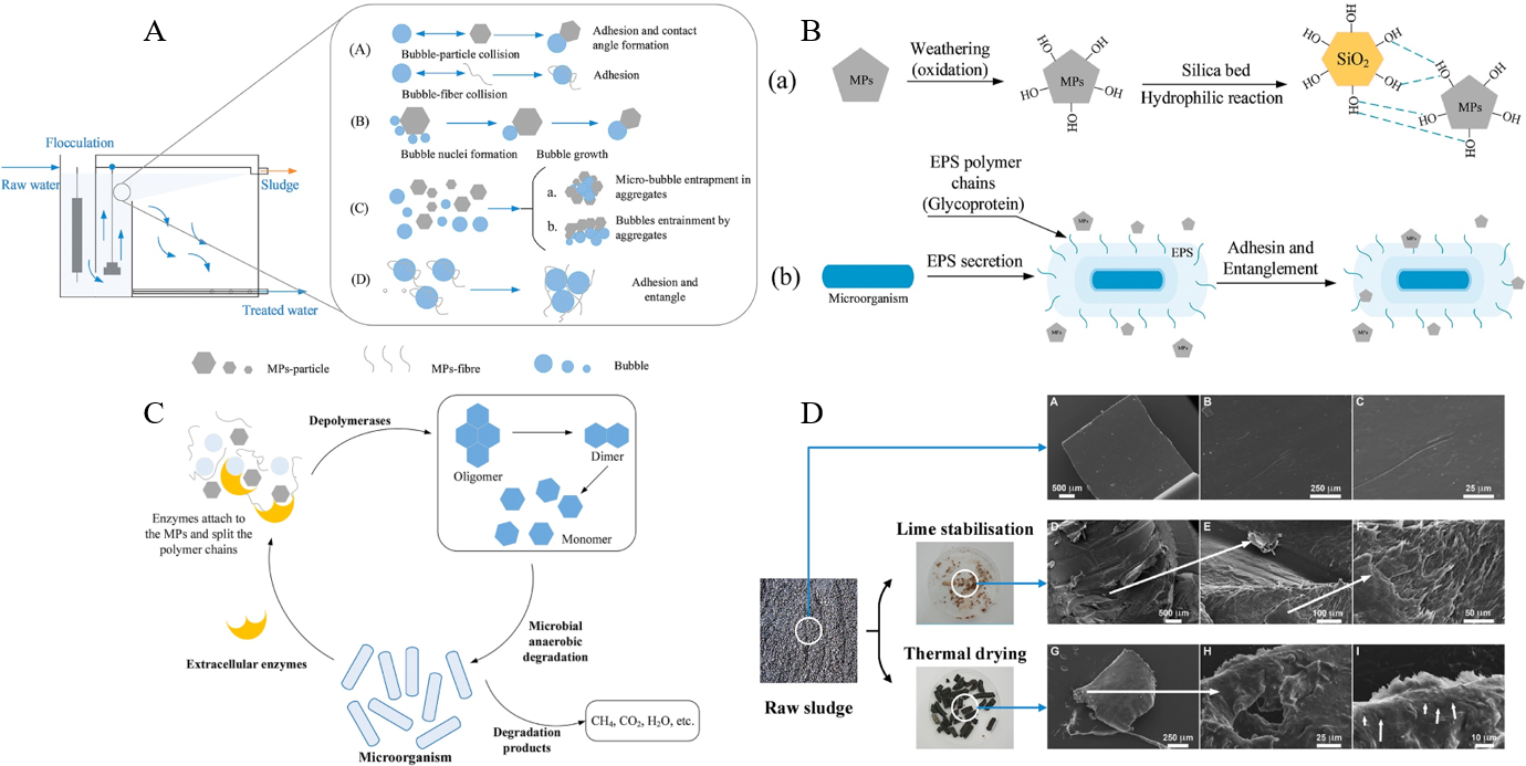 图1 污水处理厂中微塑料产生及去除机制图(A 气浮工艺去除微塑料的潜在机制;B 快速砂滤过程中的微塑料吸附机制;C 微塑料的微生物厌氧降解机制;D 污水处理工艺中HDPE颗粒形貌表征图)