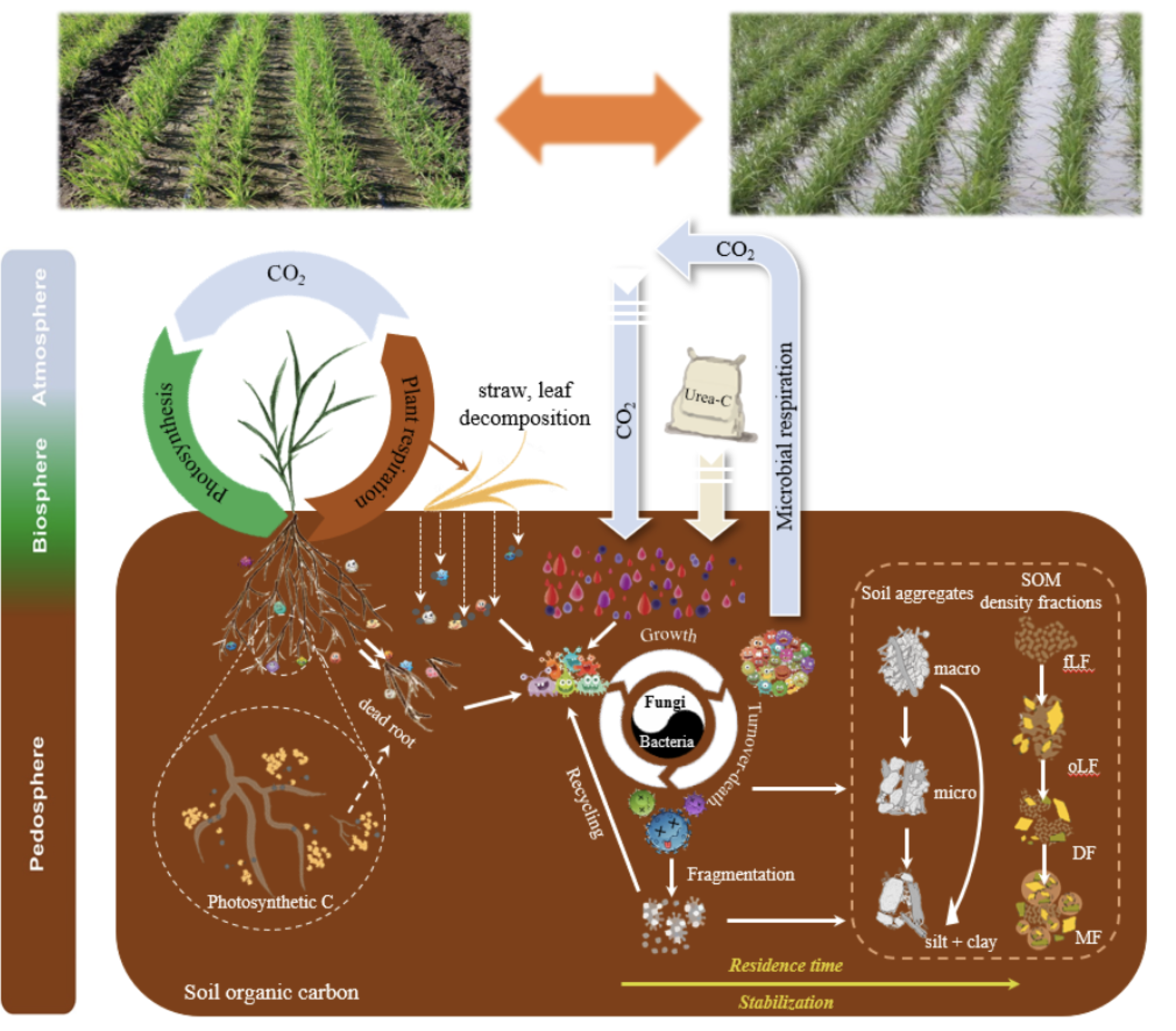 近日,我校徐俊增教授课题组在国际土壤学领域的著名学术期刊Soil Biology and Biochemistry上发表题为“Carbon pathways in aggregates and density fractions in Mollisols under water and straw management: Evidence from 13C natural abundance”的论文,揭示了节水灌溉稻田土壤碳稳定机制研究新进展。