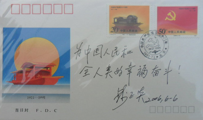 老院长在中国共产党成立七十周年纪念封上的题词:为中国人民和全人类的幸福奋斗!
