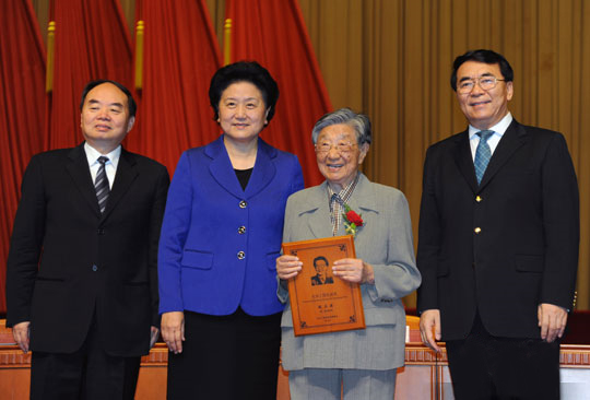 时任国务院副总理刘延东(左2)、中国科学院院长白春礼(右1)、中国工程院院长周济(左1)给老院长颁发光华工程科技奖成就奖奖牌。