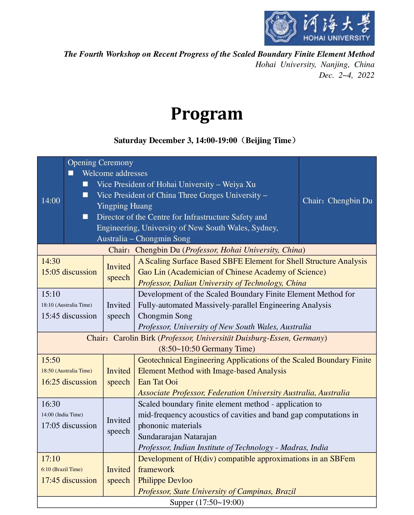 会议主题:The Fourth Workshop on Recent Progress of the Scaled Boundary Finite Element Method