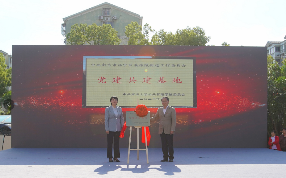 活动现场,公共管理学院党委书记蒲晓东,秣陵街道党工委副书记、办事处主任谌翠红共同为“党建共建基地”揭牌。蒲晓东表示,双方开展党建共建项目是贯彻落实习近平总书记系列重要讲话精神的重要举措,是加强基层服务型党组织建设路径的有益探索,对推动学院党建工作与社会服务深度融合具有重要意义。