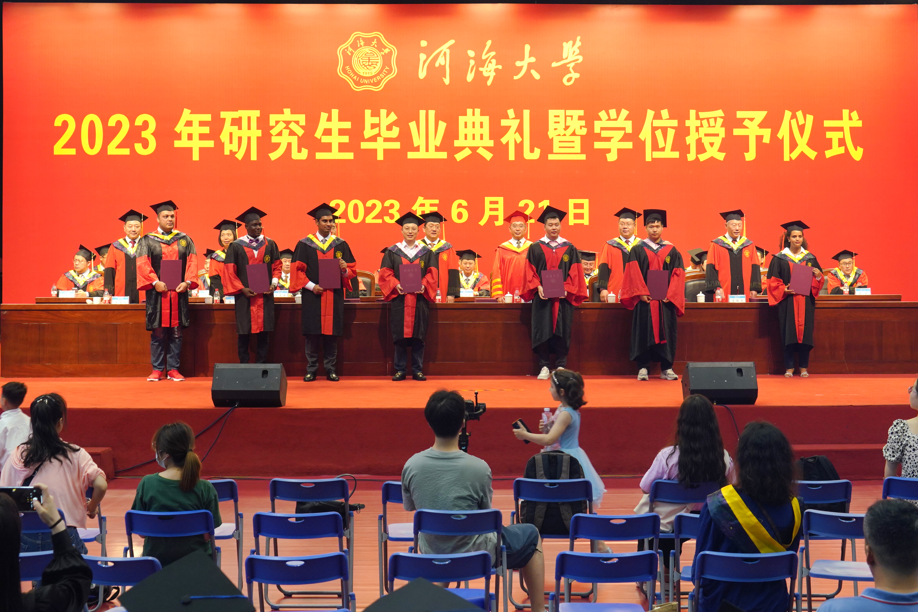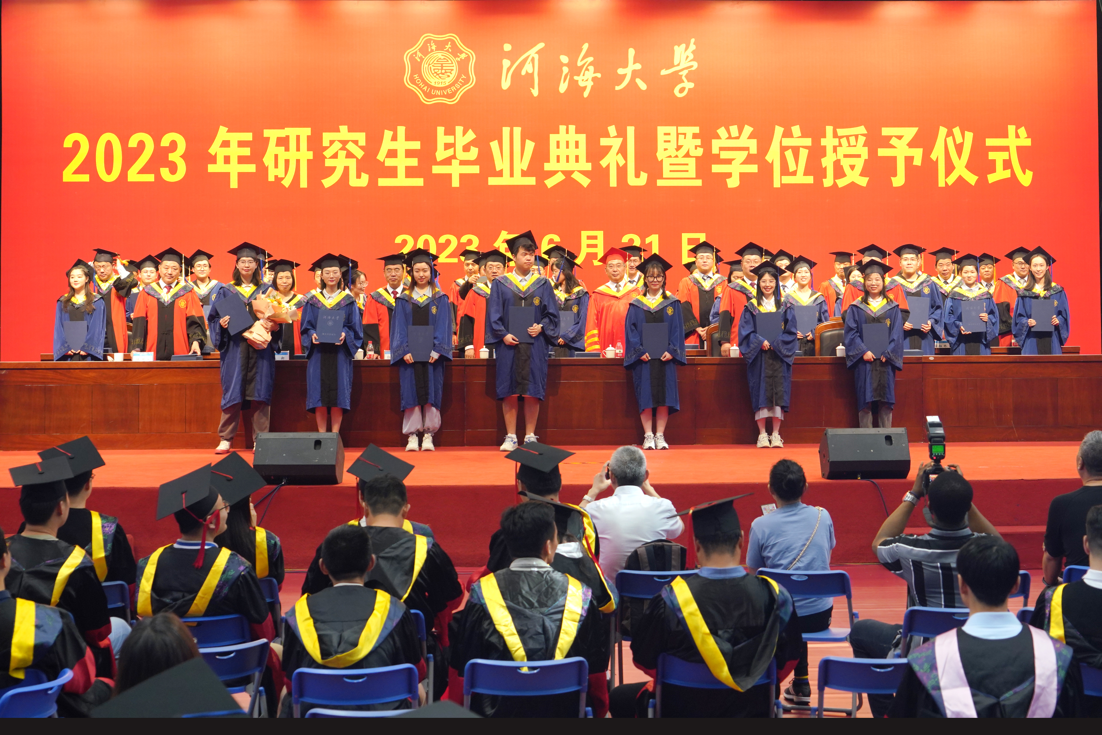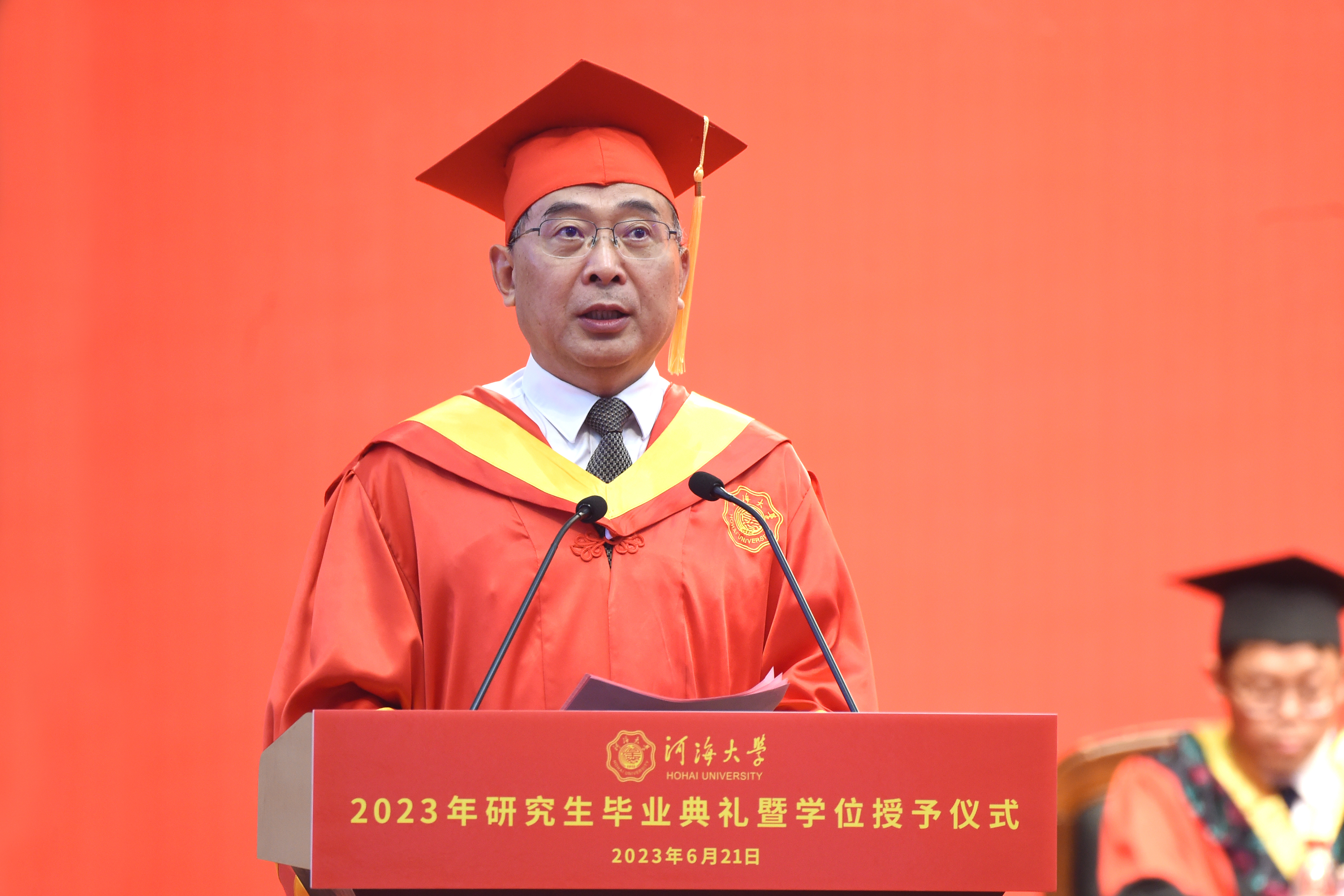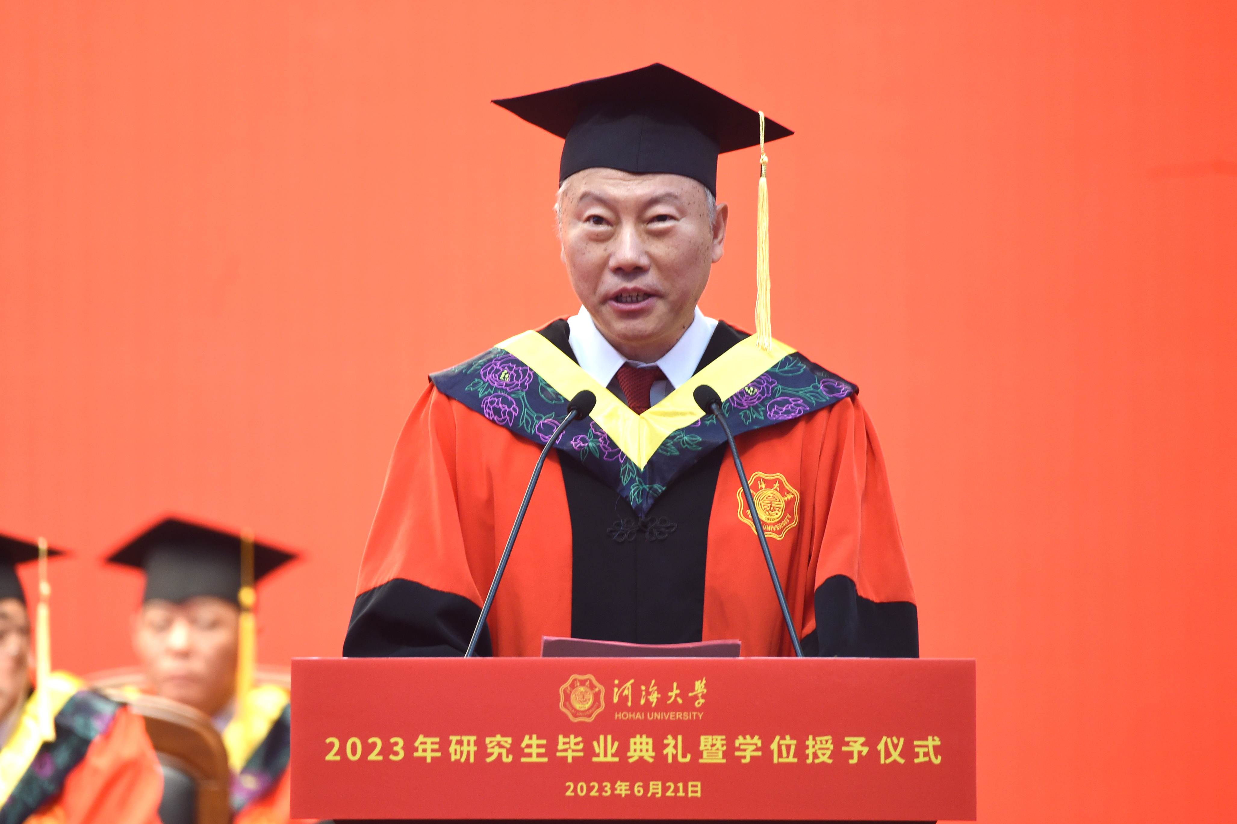 毕业典礼上,杨桂山发表了《激扬青春梦 奋进新征程》的演讲。他向顺利完成学业的全体研究生表示热烈的祝贺,向悉心培养他们的老师、关心支持他们的家人致以最崇高的敬意和最衷心的感谢。他带领大家回顾了近几年伟大祖国的繁荣昌盛和科技创新的日新月异,充分肯定了毕业研究生在创新创业、基层志愿服务、乡村振兴、国际合作交流等工作中展示出河海学子坚韧向上的精神风貌和勇毅奋进的责任担当,以及在推动学校朝着世界一流特色研究型大学阔步迈进方面作出的积极贡献。