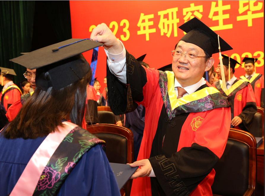 仪式上,杨桂山向典礼嘉宾徐祖信校友颁发开云电竞网荣誉证书。李俊杰介绍了2023年研究生毕业及学位授予情况,校党委副书记郭继超宣读了表彰2023届优秀毕业研究生的决定。与会领导为获得博士、硕士学位的研究生颁发学位证书,拨穗正冠,合影留念。