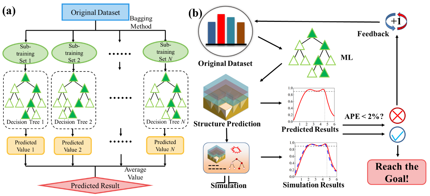 纳米加工技术的进步导致了微纳结构器件愈加复杂、设计参数更多,传统人力设计的固有缺陷也逐渐显现。由于涉及到各种不同的激励、响应、结构、材料、尺寸等,致使设计空间的复杂程度极大,如何简化设计流程,缩短设计时间成为目前亟待解决的问题之一。机器学习的快速发展为解决这一问题提供了可能,其能够从原始数据库中提取有用的信息,并输出独立的决策来执行任务。利用机器学习,能够快速准确地优化得到超表面的各种结构参数,并且能够达到极高的预测精度。