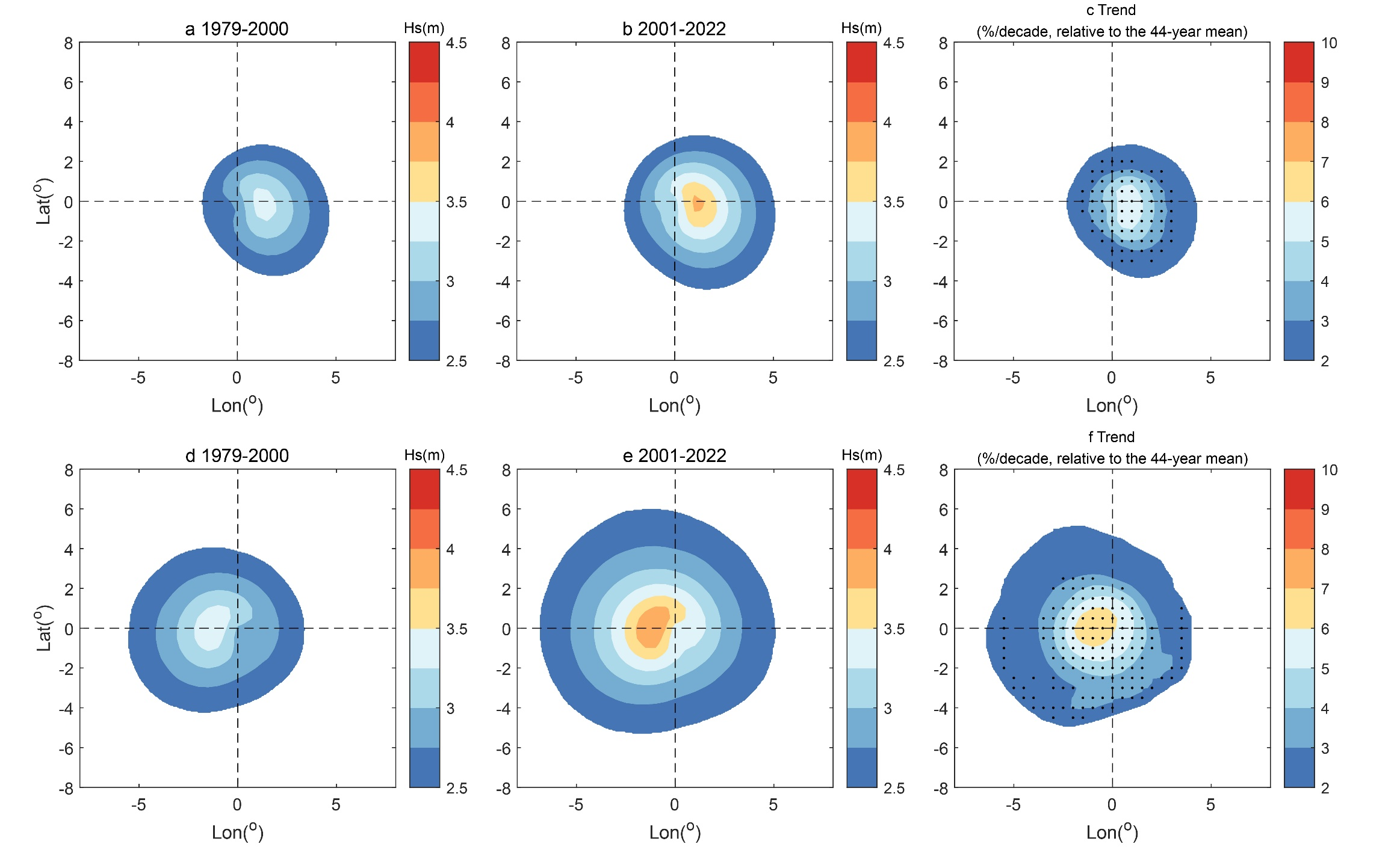 图1 1979-2000和2001-2022年南北半球台风浪平均波高和增长率分布图