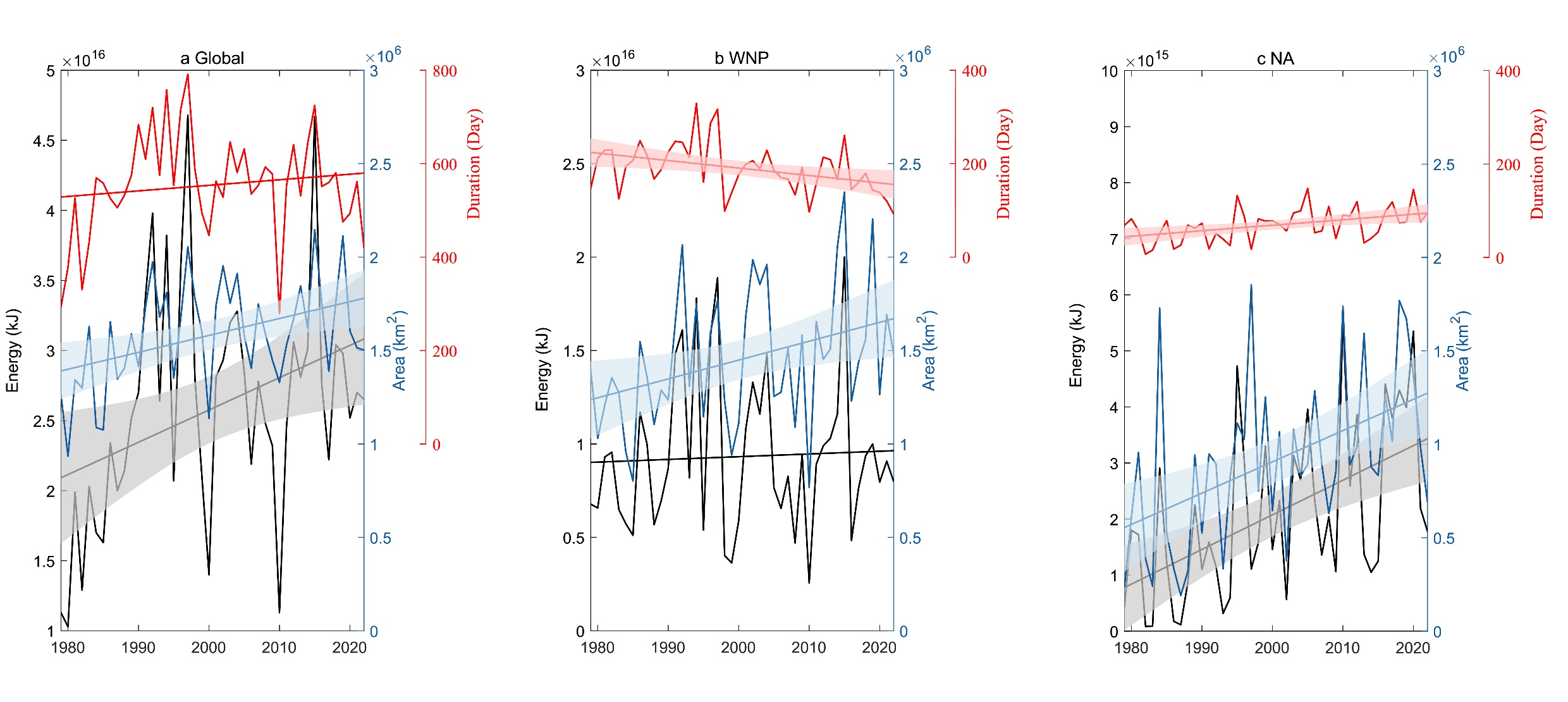 图3 全球(左)、西北太平洋(中)和大西洋(右)台风浪影响面积、累积波能和年累积作用时间年际变化和线性趋势图(蓝线:影响面积;黑线:累积波能;红线:年累积作用时间)