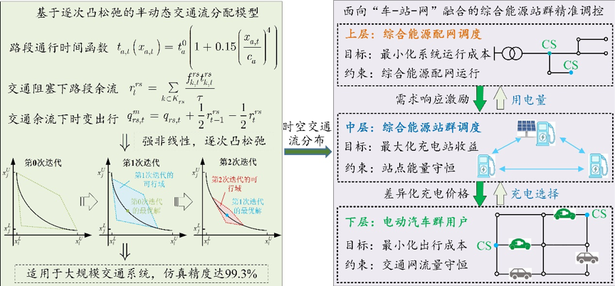 在分散资源调控方面,提出了基于逐次凸松弛的半动态交通分配模型,通过交通余流刻画了充电需求时空耦合特性,实现了复杂非线性交通流的精准高效仿真;提出了基于差异化价格激励的车-站-网融合调控方法,实现了面向配电网灵活调节的电动汽车群有序充电,避免了充电负荷与用电负荷的“峰上加峰”问题,挖掘了海量分散综合能源资源灵活调控潜力。