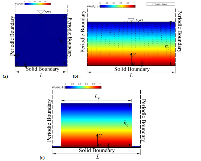 图2 本研究采用的3种具有不同流动剧烈程度的算例:(a)静水、(b)驻波和(c)溃坝