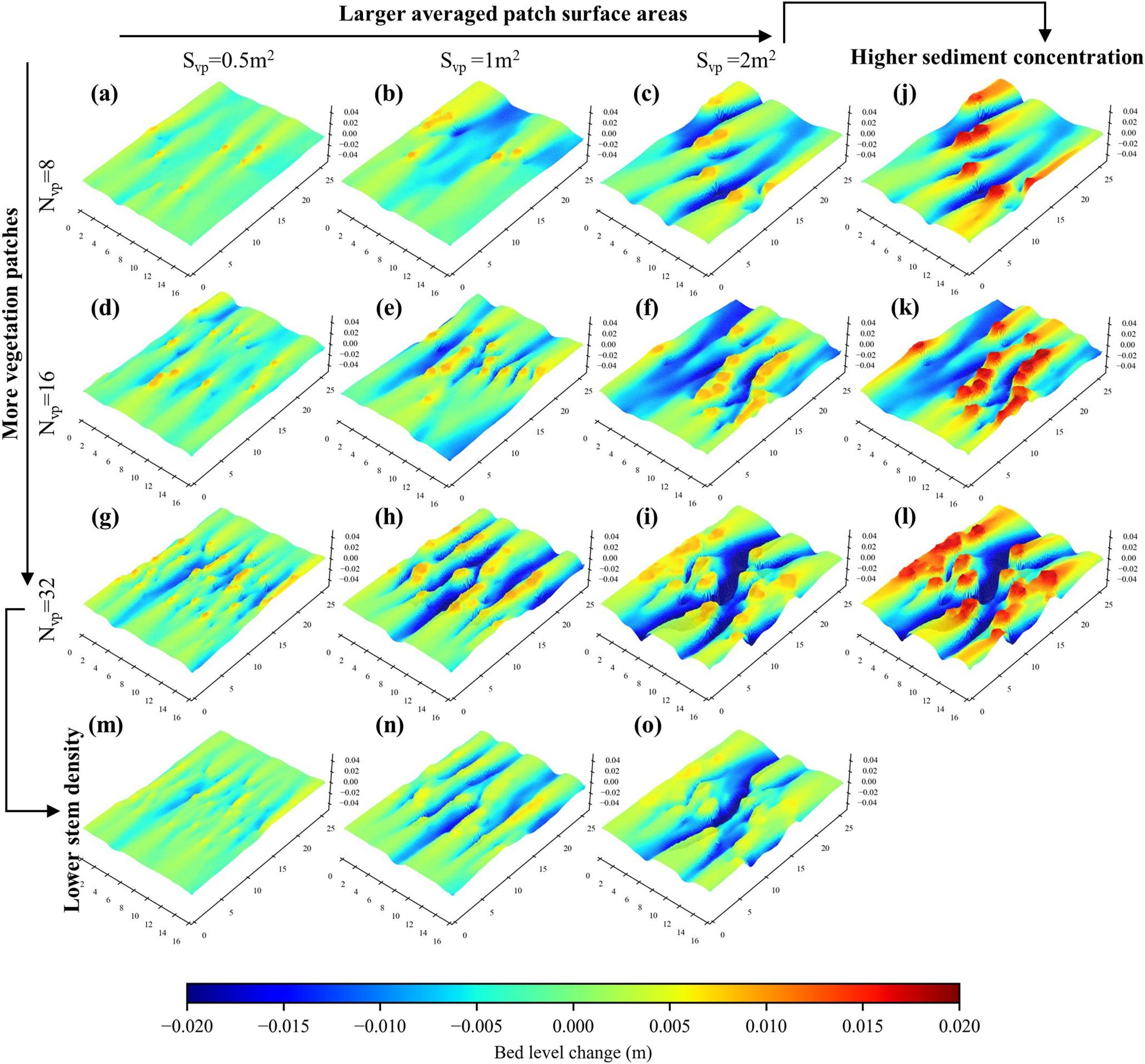 图3 不同盐沼植被斑块分布与边界条件下的地貌演变模拟结果
