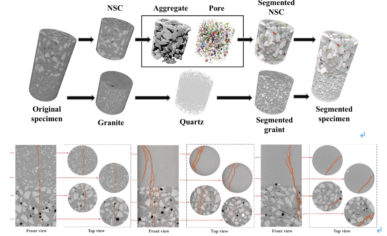 图3:基于X-CT的湿喷混凝土-围岩三维结构重建及裂隙扩展路径图
