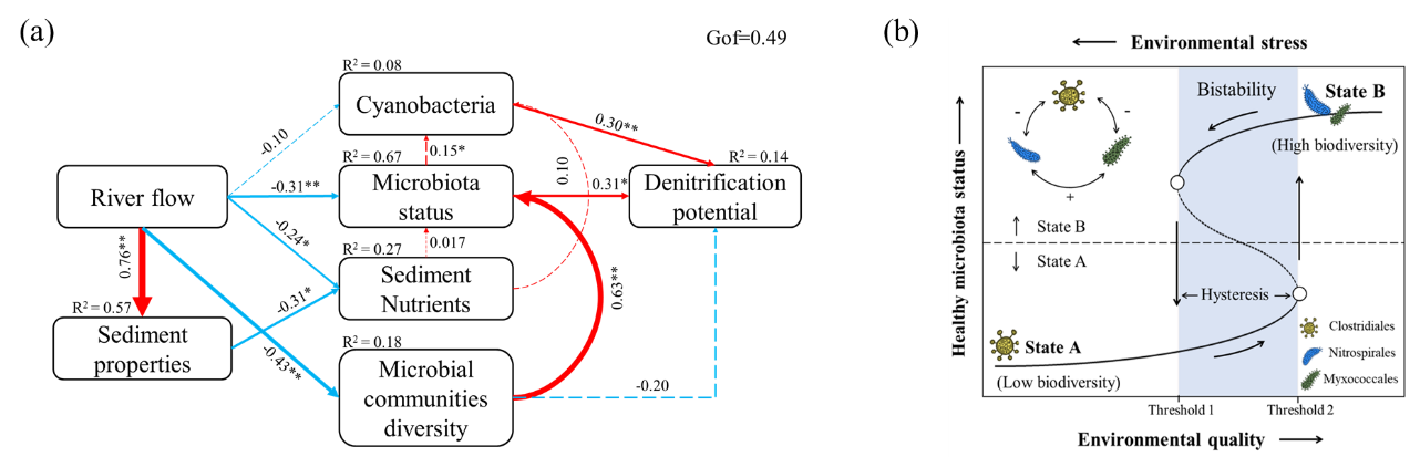 图1(a)长江干流水文条件对细菌群落状态的影响路径;(b)长江下游环境压力对细菌群落稳态转换过程的影响机制