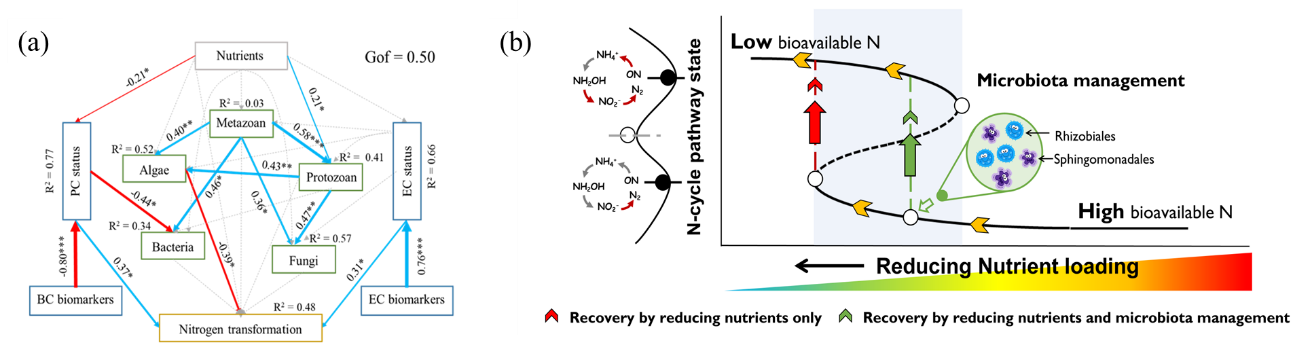 图2(a)营养负荷对多营养级微生物群落结构的影响路径;(b)营养负荷对氮转化功能的影响机制