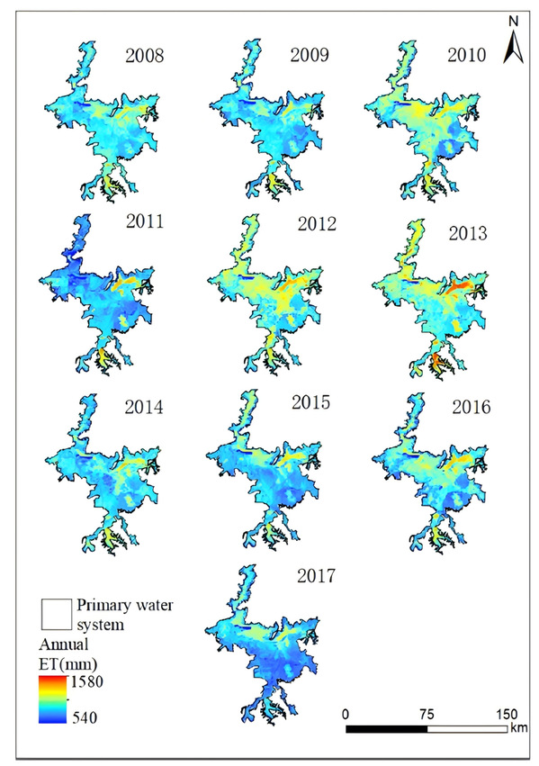 图3 2008-2017年鄱阳湖湿地年蒸散空间分布图
