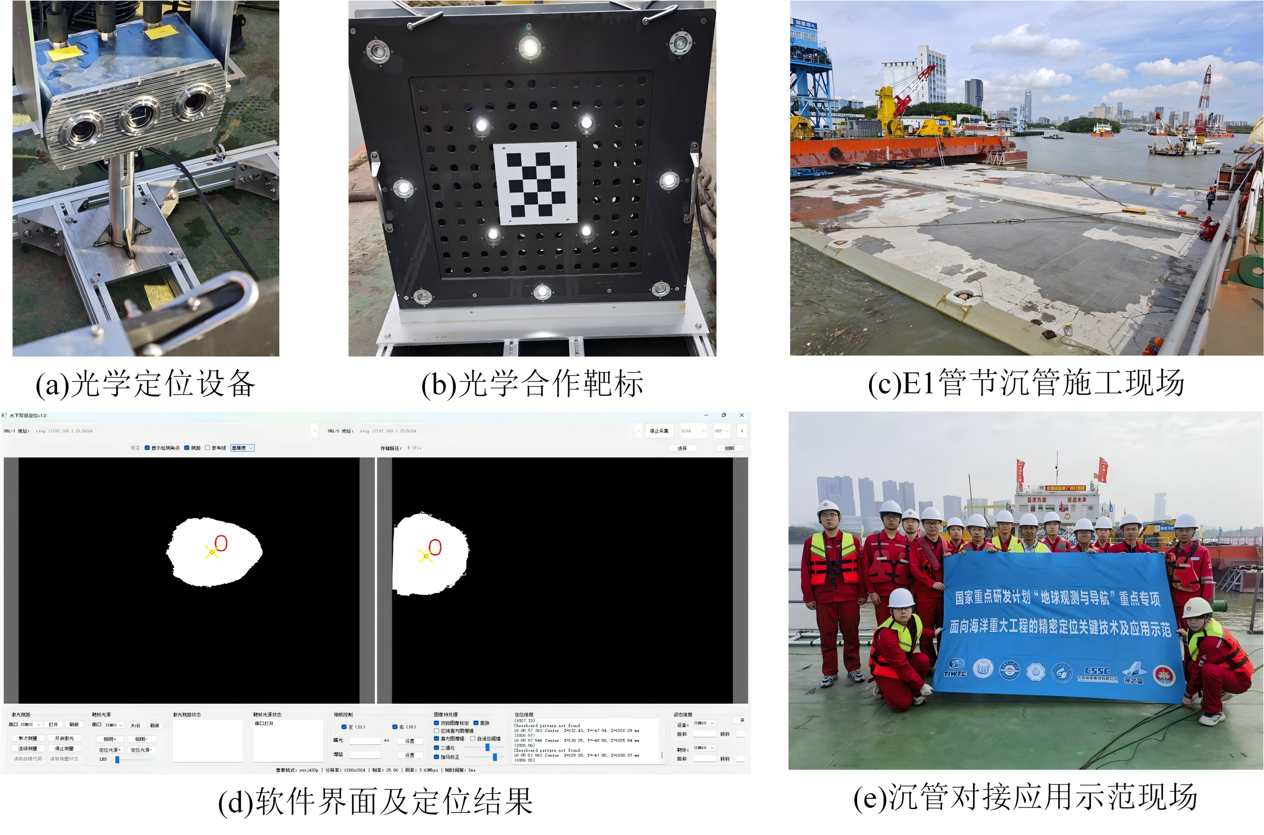为提高不利水体下光学定位的精度,提出并研发了双目偏振视觉与激光测距融合的水下高精度定位方法;同时,考虑不利水体衰减带来的作用距离降低与水体散射带来成像质量退化等影响,联合中国船舶集团有限公司第七一七研究所研发了主、被动联合的水下光学合作靶标。研发的设备经权威机构检测,在透明度为0.7m水体中探测距离可达3m,定位精度可达1mm。设备在国家级重大工程——广州鱼珠隧道沉管对接施工中得到了应用示范。鱼珠隧道位于广州城市发展的核心区域,连接海珠区、天河区和黄埔区,采用沉管隧道方式下穿珠江。在沉管对接过程中,团队将光学定位设备安装于固定沉管(E1管节)一端,合作靶标安装于待对接沉管(E2管节)一端,当E2管节经北斗、声呐等辅助手段引导至E1管节约3–5米范围内时,启动光学定位设备与合作靶标,进入高精度光学定位阶段,利用自研软件实现图像采集、合作靶标光源控制、激光测距、图像去散射和光学定位功能。针对珠江流域高浊度水体,在图像去散射的基础上,通过提取靶标光斑实现mm级的全自动水下光学定位,实现了沉管的精准对接。