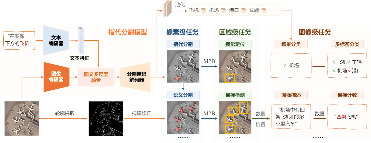 为解决遥感难以兼容多种视觉任务的问题,团队研发了统一多视觉任务的轻量型感知模型RemoteSAM,在一个模型中同时支持分类、检测、分割和定位等8种遥感任务。不同于以往依赖特定任务头微调或基于大语言模型的文本生成范式,该研究提出了一种以“指代分割”任务为核心的统一架构。模型以像素级掩码作为基础计算单元,能够无缝转换为检测框、类别标签或计数结果。RemoteSAM以更小的参数量(180M)在多个基准测试中超越了Falcon、GeoChat等七十亿(7B)参数级模型,实现了高效、高精度的统一感知。