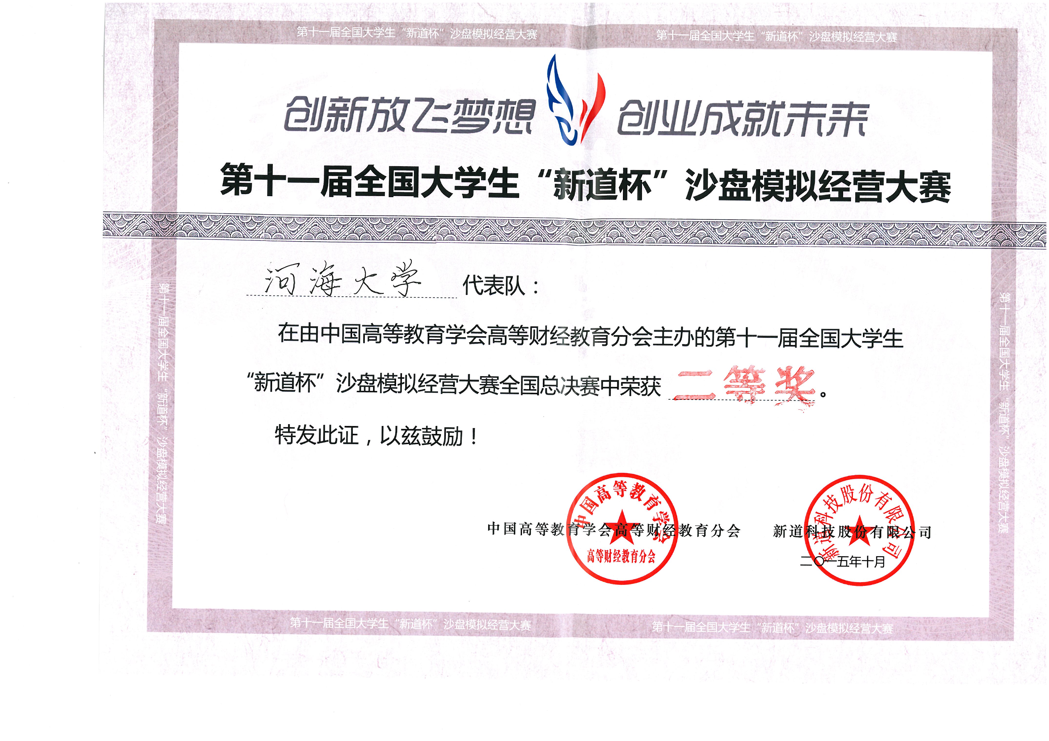 10月24日,由中国高等教育学会高等财经教育分会主办、西安培华学院承办、新道科技股份有限公司提供技术支持的第十一届全国大学生“新道杯”沙盘模拟经营大赛全国总决赛在西安培华学院隆重举行。据悉,共有108所院校、540名选手参赛,每队5名参赛选手,分别担任总经理、财务总监、生产总监、营销总监、采购总监。