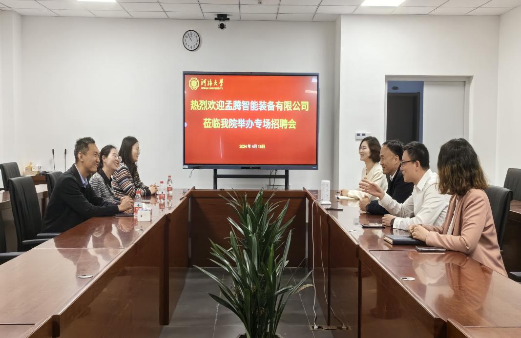 院党委书记董涌波对孟腾公司一行来学院招聘表示热烈欢迎,详细介绍了学院发展、学科建设、师资队伍以及人才培养等情况。院党委副书记李晓东围绕学生培养、实习实践、就业服务、平台建设等方面进行了交流。孟腾公司人事经理陈梅对学院提供的专场招聘机会表示感谢并转达了董事长的问候,希望作为与智能院专业高度契合的智能化制造公司能够进一步加强与学院的联系,在项目合作、人才培养、人员招聘等方面开展更加广泛的合作。