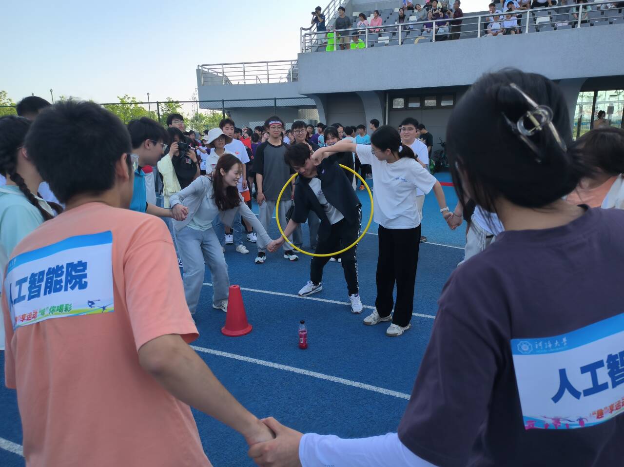 第一场比赛项目是一圈到底,考验的是身体的协调性,运动员们紧紧拉住彼此的手,将呼啦圈快速传递给队友,现场传来阵阵欢笑与呐喊声。