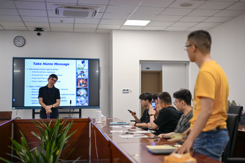 讲座结束后,现场观众踊跃提问,讨论环节气氛热烈。学生们纷纷就他们关心的问题与Cangelosi教授进行了深入交流,从技术细节到伦理问题,讨论范围广泛。Cangelosi教授耐心地回答了每一个问题,展示了他渊博的学识和对学生们的关心。在讲座之外,Cangelosi教授还参观了人工智能与自动化学院的认知与机器人实验室。在实验室中,他详细了解了学院在认知科学和机器人技术方面的研究进展,并与实验室的研究人员进行了深入交流。特别是在参观人形机器人时,Cangelosi教授表现出极大的兴趣,并与现场的研究人员和学生们讨论了人形机器人在实际应用中的潜力和挑战。