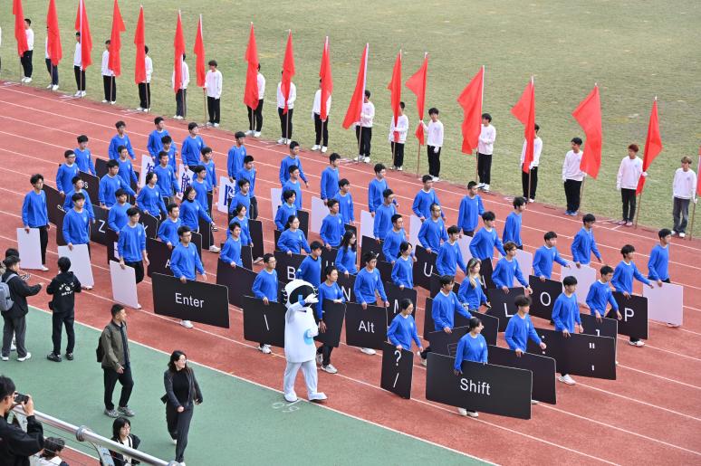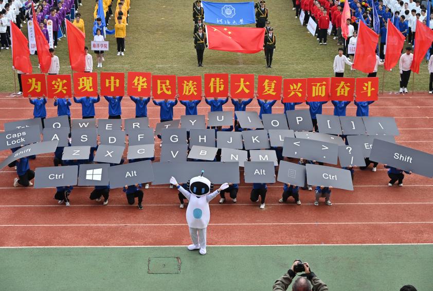 随着向主席台的靠近,智能学子一齐举起手中的“Shift”,“Ctrl”等,汇聚成一个完整的大键盘,后方的同学高举的大字形成“为实现中华民族伟大复兴而奋斗”的红色条幅,前面身着机器人服装的同学向主席台挥手互动,整个方阵寓意着智能院的学子们期待在人工智能的浩瀚星空中绽放光芒,凭借自己的专业能力为实现中华民族伟大复兴贡献自己的力量。