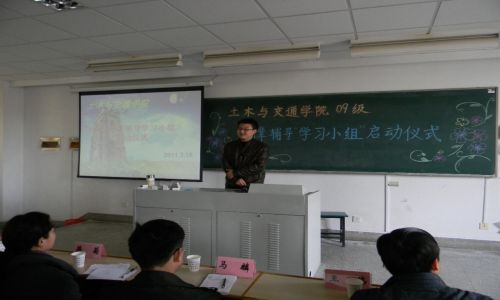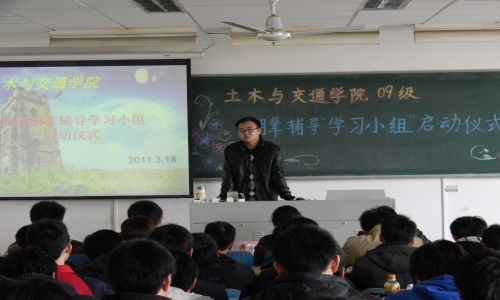 3月18日下午,土木与交通学院09级朋辈辅导“学习小组”启动仪式在江宁校区隆重举行。出席此次启动仪式的领导和老师有土木与交通学院党委副书记蒋菊,09级土木工程专业班导师老师代表马麟老师、王伟老师,09级辅导员张剑宇老师与10级辅导员吴昊老师。