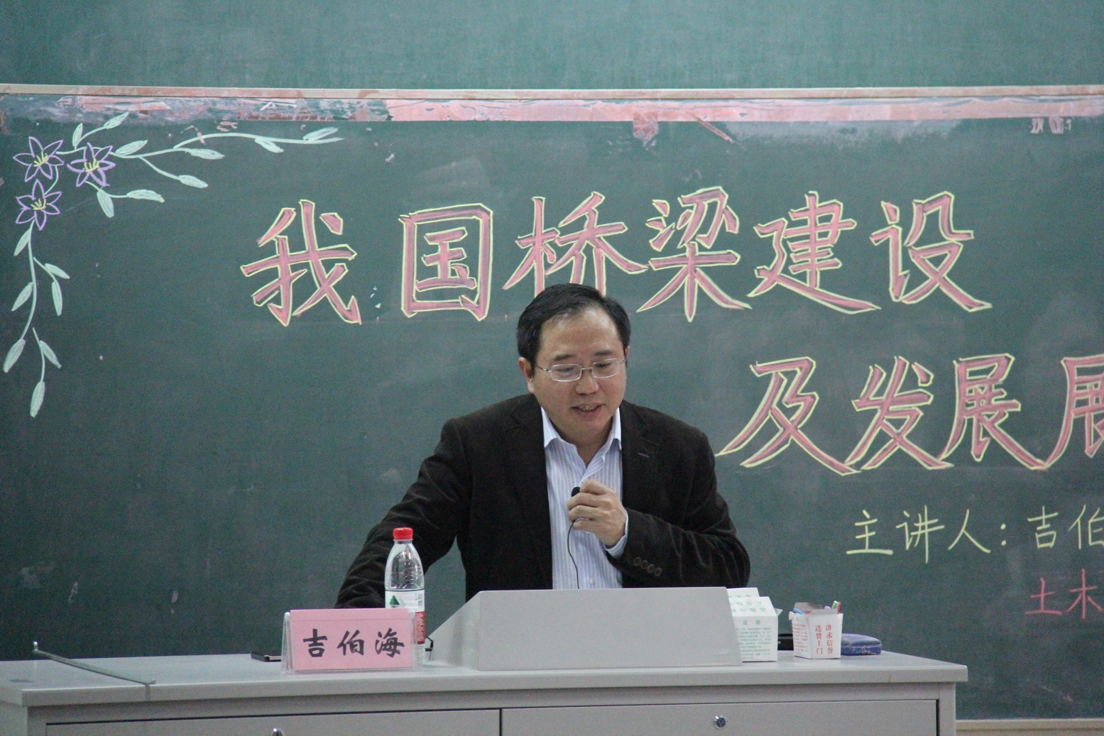 首先,吉教授为学生们概要地介绍了我国道路发展现状,引出本次讲座主题——道路发展中不可缺少的桥梁建设,并指出桥梁建设是国民经济中的大动脉,桥梁建设以惊人的规模和速度发展,这既是机遇也是挑战。然后,吉教授形象生动地讲解了桥梁工程的基本组成构件,并按不同的方式将桥梁进行了分类,详细地分析了桥梁与普通房屋结构设计上的区别。接下来教授讲解了我国的桥梁发展历程及世界桥梁发展史,举例介绍了我国桥梁发展史上的里程碑:宝带桥、钱塘江大桥、长江大桥。吉教授还分析了当前中国桥梁发展中存在的问题,特别强调了目前最需注重的自主创新。最后吉教授就桥梁与隧道学科作了简要的介绍。