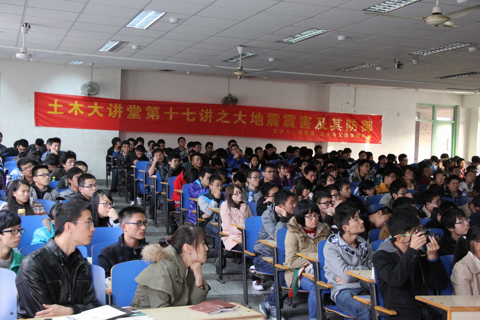 2013年11月25日下午3:30,土木大讲堂第十七讲之“大地震灾害及其防御”在致用楼101教室举行。本次讲座由土木院院长刘汉龙教授主讲,土木院2012级辅导员王老师主持,土木院2013级辅导员丁老师及2011级、2012级学生参加。