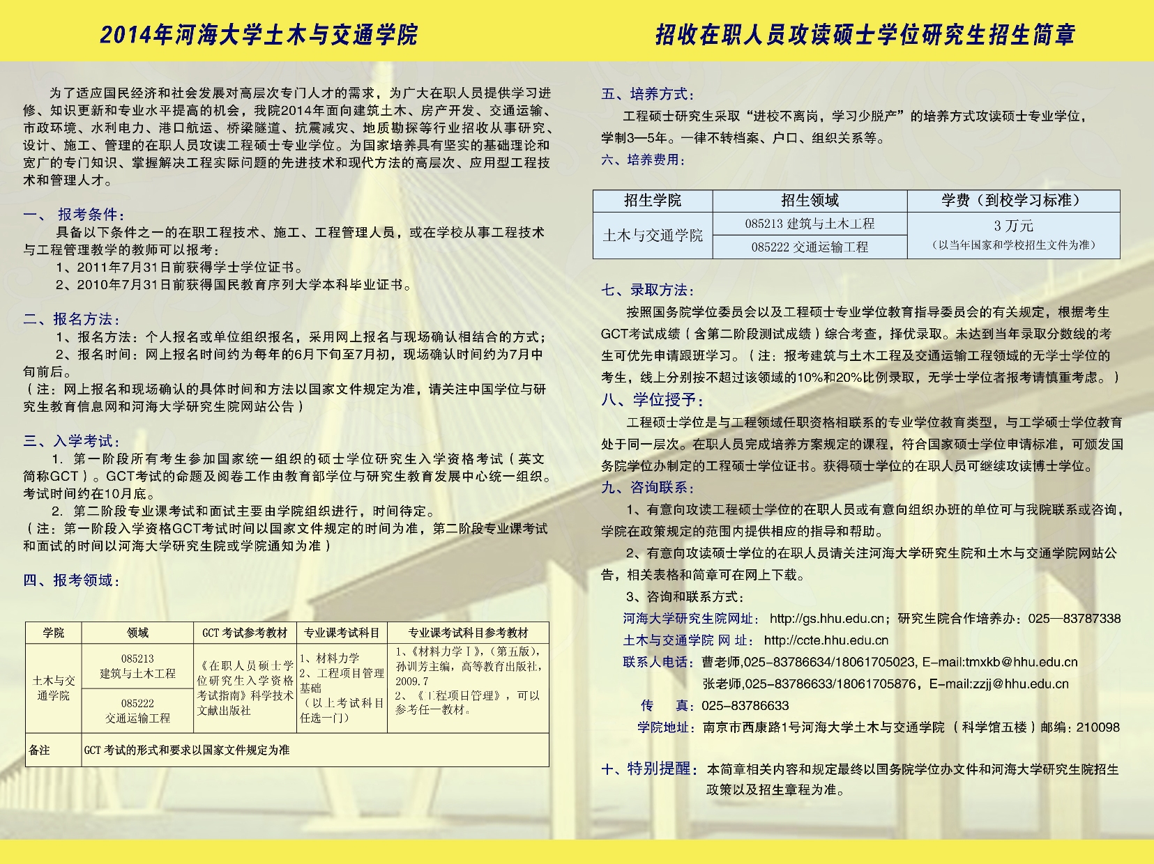 2014年开云电竞网土木与交通学院招收在职人员攻读硕士学位(非全日制工程硕士)招生简章