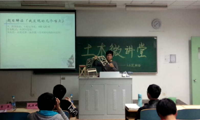 李强同学为同学们讲解了各类结构设计大赛的规则,强调要注意结构的自重大小、施工工艺及模型的结构优化,指出结构制作实践重于理论,要大胆实践。并以以往比赛中的优秀作品为例,具体分析了作品的结点、杆件。线洪鹤同学则讲解了比赛的解题思路,提出了结构设计的核心框架和制作的几点建议,并结合实体模型作了解释。李显同学着重分析了当前的参赛形势,并就团队协作精神和同学们进行了交流,鼓励同学们为共同的目标而奋斗。在最后的提问环节,同学们对结构大赛的细节问题提出疑问,学长们细心地一一作了解答。