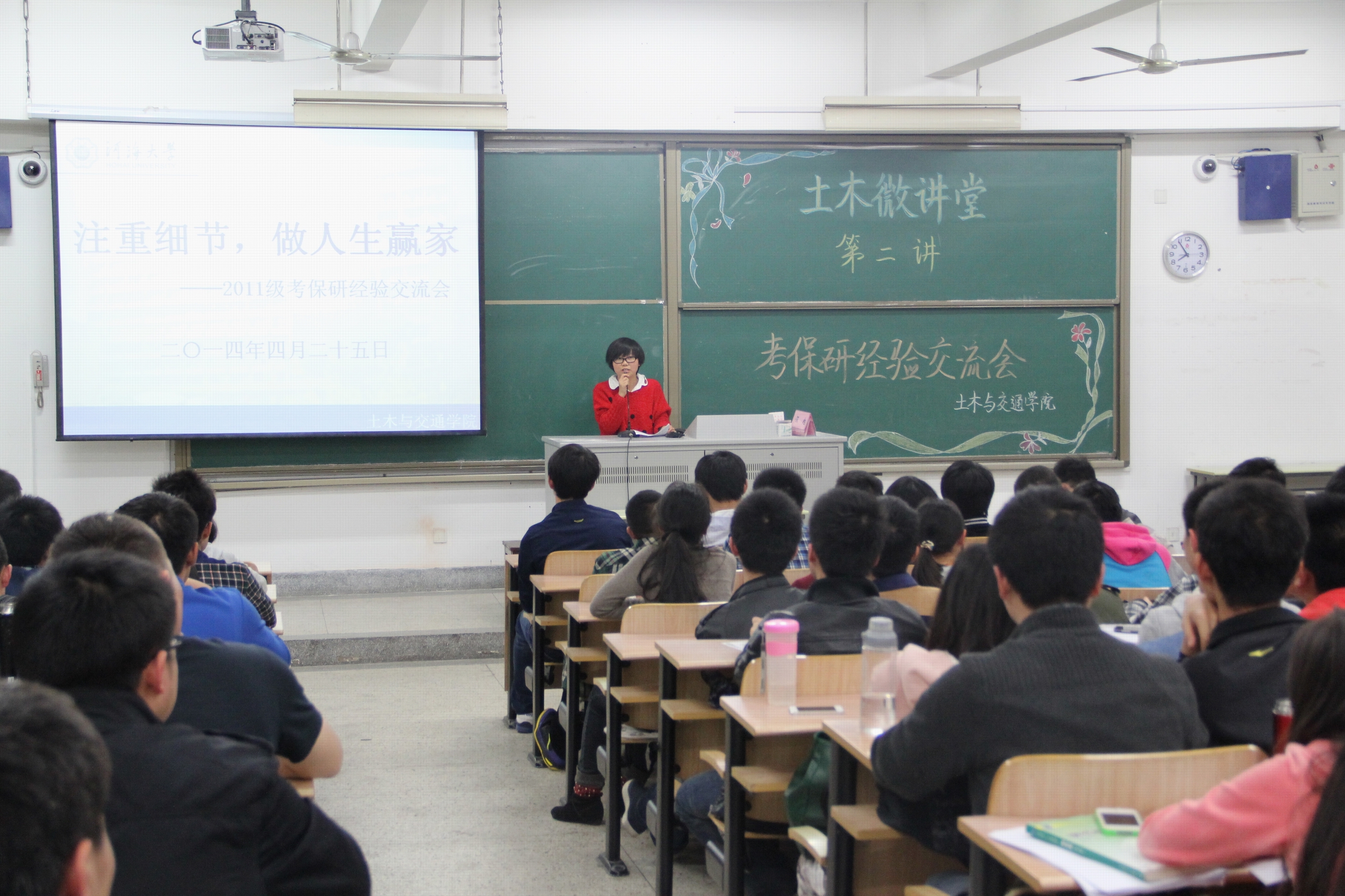 为了帮助同学们确立目标,使同学们熟悉考、保研的具体流程和相关政策,2014年4月25日晚,土木与交通学院土木微讲堂第二讲之考研保研经验交流会在闻天馆303教室召开。本次微讲堂邀请了10级顺利考研、保研的24位优秀学生代表到会与同学们分享交流,就考保研的基本流程、学科复习以及选择导师等事宜为同学们指点迷津。