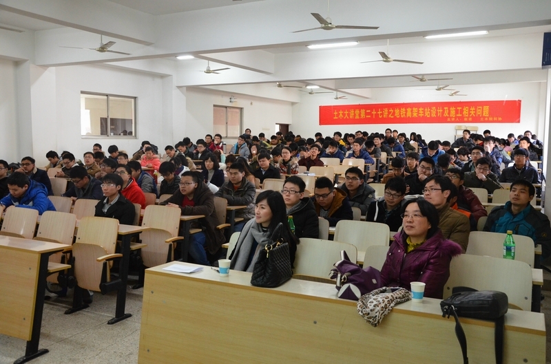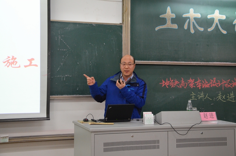 本次讲座主题为《地铁高架车站设计及施工相关问题》。赵工从地铁车站简介入手,将车站分为地铁车站和高架站两种类型。接着,以建筑布局、施工方法、车站组成的形式多方面地阐述了两种车站在建造时的异同点和需要注意的地方。并通过设计计算分析,解释了车站建造是建筑方面的极限状态承载力和桥梁方面的铁路桥涵容许应力法的有效结合。随后,向学生们介绍了一些项目建设中遇到的问题及解决的办法,并且通过对混凝土强度小于设计强度、钢结构柱发生偏压等设计失误等细节介绍地向学生们解释了一个小的施工误差造成的巨大经济损失。赵进高工言语幽默风趣,利用大量图片和视频,深入简出,易于理解,便于掌握。最后,他还特别强调生们要严谨对待工程中的每一个问题。