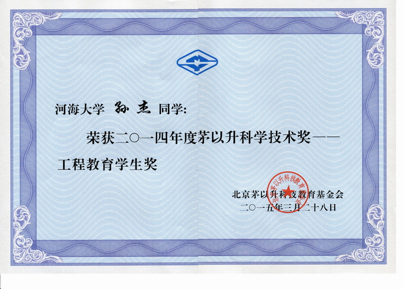 2015年5月26日,茅以升科技教育基金会第二十四届颁奖大会在西安举行。我院2011级土木工程专业本科生孙杰同学荣获2014年度“茅以升科学技术奖——工程教育学生奖”。