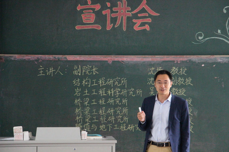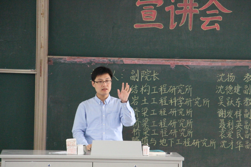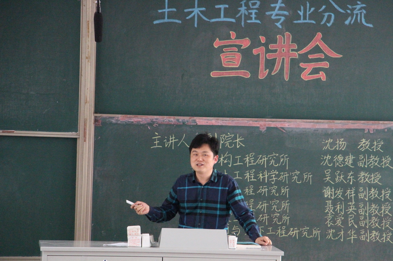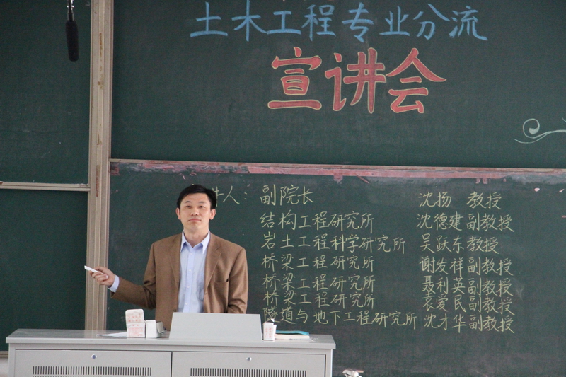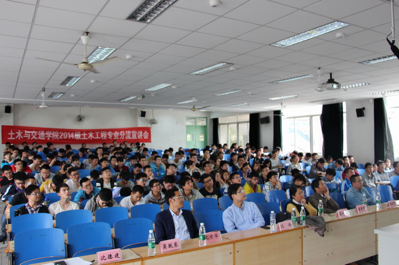 2016年5月13日下午2时,由土木与交通学院本科生科协承办的2014级土木工程专业分流宣讲会在江宁校区致用楼101教室成功举行。本次宣讲会有幸邀请到土木与交通学院岩土所副所长吴跃东教授、结构所副所长沈德建副教授、隧道所副所长沈才华副教授、桥梁所副所长谢发祥副教授作有关各专业方向的介绍。出席此次宣讲会的还有学院沈扬副院长、桥梁所聂利英副教授、袁爱民副教授、2014级辅导员张洁和2014级全体土木工程专业(含大禹班)学生。