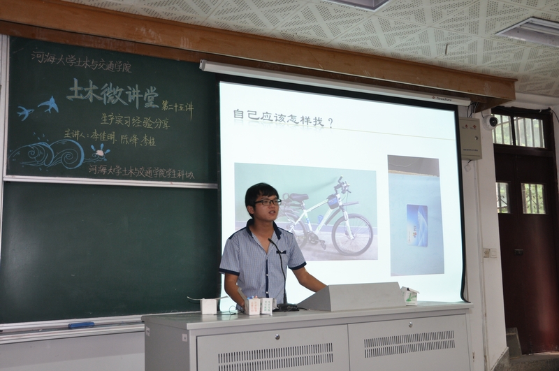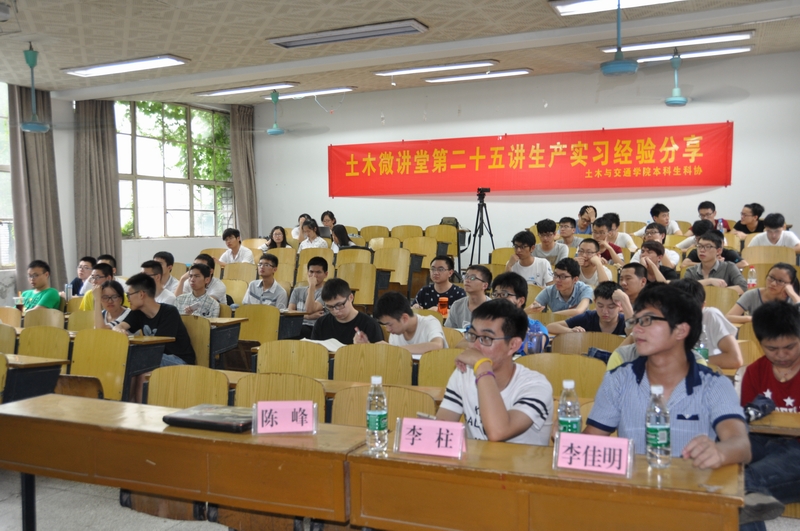 2016年6月21日晚6:00,土木与交通学院“土木微讲堂”第二十五讲之“生产实习经验分享”在本部管理楼201成功举办。本次微讲堂邀请了2012级土木专业的李佳明、陈峰和李柱三位同学作为主讲人,为学院2013级的同学们分享自己暑期生产实习过程中的经验。