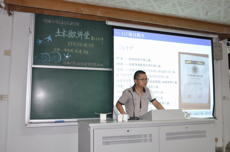 首先,由李佳明同学讲述自己参与生产实习的经历。李同学先从寻找生产实习单位开始介绍,讲到可以直接联系施工单位的项目经理,也可以到施工地点调研后再做决定。之后,他为大家提醒了在实习中需要注意的事项,强调应当加强安全意识,注意安全,把人身安全放在第一位。其次,通过PPT上照片的展示,李同学解释了自己在工地实习过程中所从事的工作,由基础的放线测量工作到最后的混凝土浇筑振捣,一一做了详细讲述。然后,由陈峰同学与大家分享实习经验与心得。陈峰同学先对自己实习的项目做了简要介绍,即天津高银117大厦项目,实习的两个月结束之时,他见证了大厦的封顶。陈同学向大家展示了该项目的总平面图、一般层平面图等图纸,并介绍了一些施工技术,同时陈同学表示该大厦项目在模板工程上采用了独创的新技术,不同与一般的滑模等方法。最后一位主讲人为李柱同学,他的实习单位为河北省万兴建筑安装有限公司。李柱同学指出在工地实习时应当提前做好准备,复习好经纬仪等仪器的使用方法,并主动向指导自己的师傅以及其他技术工人请教学习。同时,他还向大家简要介绍了实习结束返校时的答辩环节以及科技论文的写作注意事项。讲座结束后在座同学们与几位主讲人做了相关问题的讨论。