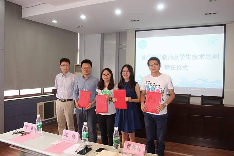 接下来进行分会指导教师及学生技术顾问的聘任仪式。由沈院长为指导教师代表喻君、胡锦林,和学生技术顾问代表龚云浩、周沛然颁发聘书。